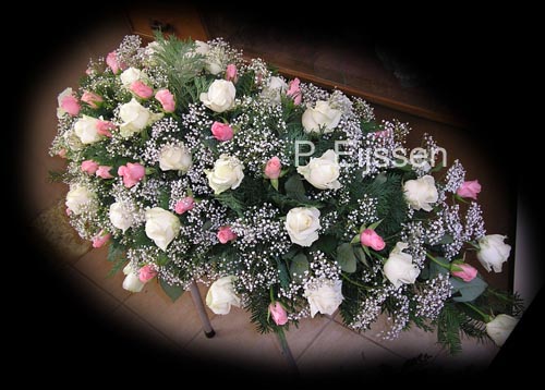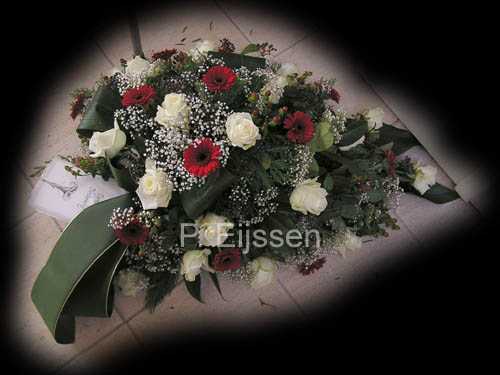 of zaal. Grafwerk kan voorzien worden van een lint naar keuze of een persoonlijke (afscheids)tekst. In overleg kan ieder bloemstuk op de plaats van bestemming afgeleverd worden. Het bespreken van bloemwerk kan zowel 's avonds als overdag plaatsvinden. Ook na 18.00 uur en in het weekend zijn wij telefonisch bereikbaar. Hieronder ziet u 2 voorbeelden van grafwerk. Ook voor het grafwerk geldt dat bij een persoonlijk gesprek keuze is uit een scala aan mogelijkheden, afgestemd op uw persoonlijke wensen, of die van de overledene. |
