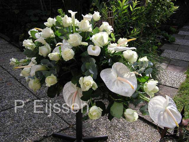 Kistversiering met Anthuriums, Calla's en witte rozen.